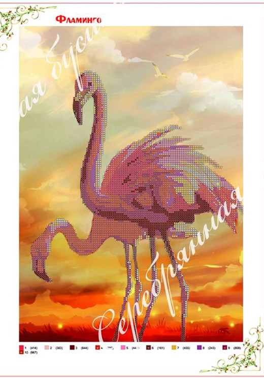 Одна из самых любимых тематик для вышивки бисером с птицами - это фламинго. Считается, что эти птицы несут благосостояние в дом, удачу в любовных отношениях. Данная схема для бисера изображает пару ярких фламинго в оранжевых тонах на фоне заката. Вышитая схема также прекрасно подойдет для украшения вашей комнаты, ведь сама работа выполнена в весьма ярком и современном стиле!