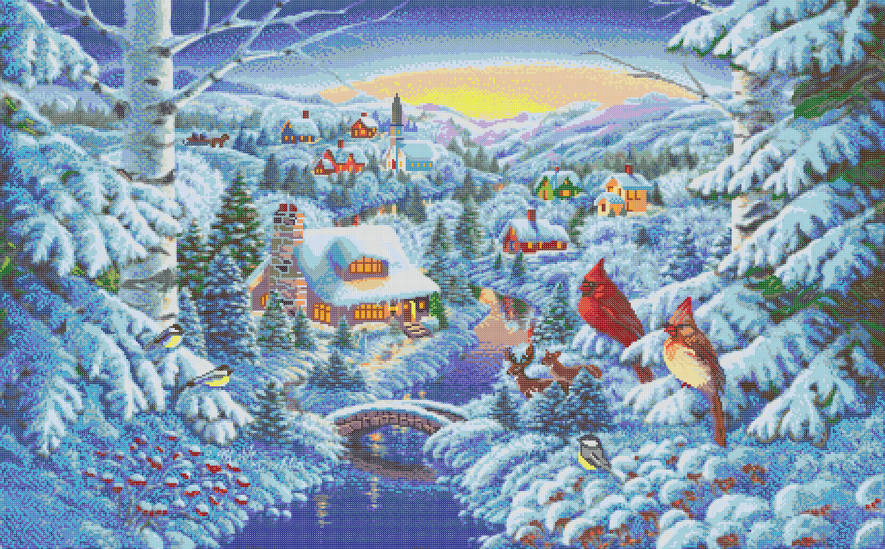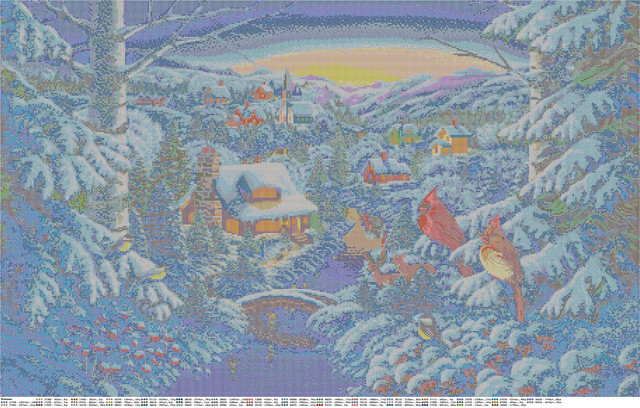 Схема з затишним будиночком на тлі зимового пейзажу. Створює відчуття присутності зимової краси, новорічного настрою, наближення свята. Робота насичена відтінками синього, білого і блакитного, світлих тонів. Головна задача картини - передати красу зимової пори року і змусити глядача милуватися цією схемою для бісеру, уважно розглядаючи її деталі.